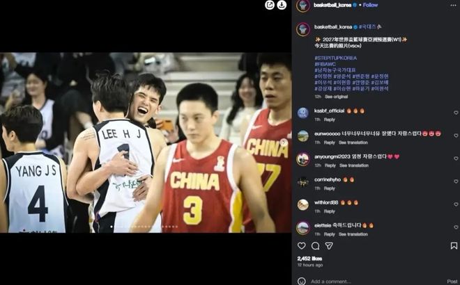 韩国媒体对于韩国能够双杀中国男篮十分兴奋,他们在报道的时候,恰好就用了韩国球员庆祝,胡明轩在旁边低着头的照片。