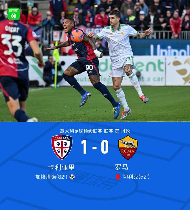 北京时间12月7日,意大利足球顶级联赛第14轮,卡利亚里坐镇主场迎战罗马。比赛中,罗马球员切利克因犯规被罚离场。随后,卡利亚里抓住机会,塞巴斯蒂亚诺-埃斯波西托送出助攻,加埃塔诺冷静破门得分。凭借此球,卡利亚里以1-0战胜罗马,全取三分。