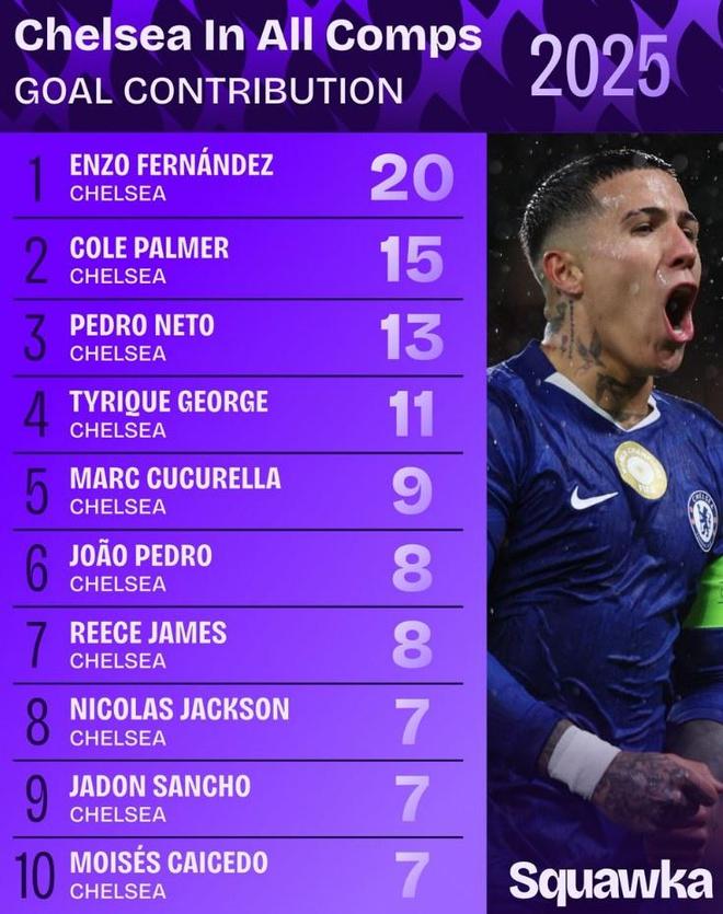 数据网站Squawka盘点了2025年切尔西球员各项赛事参与进球榜单,具体如下(进球+助攻):