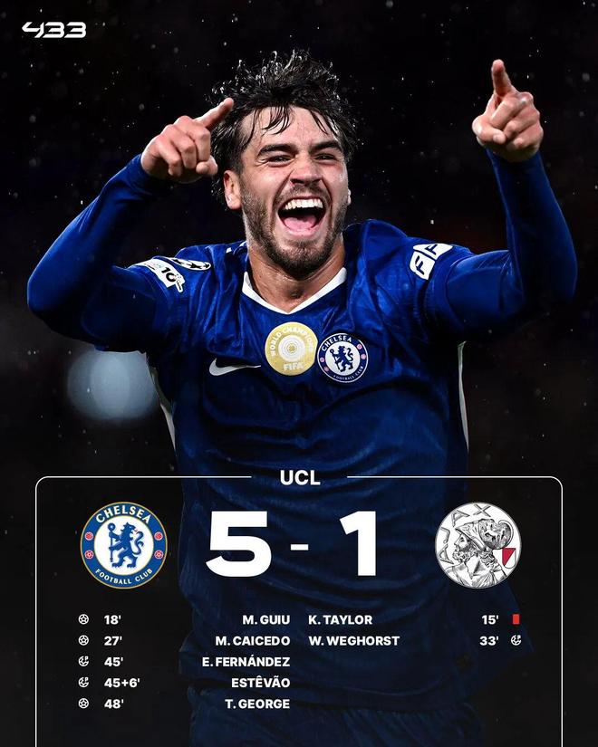 2025年10月23日 四连胜!切尔西5-1十人阿贾克斯 恩佐、埃斯特旺点射凯塞多建功