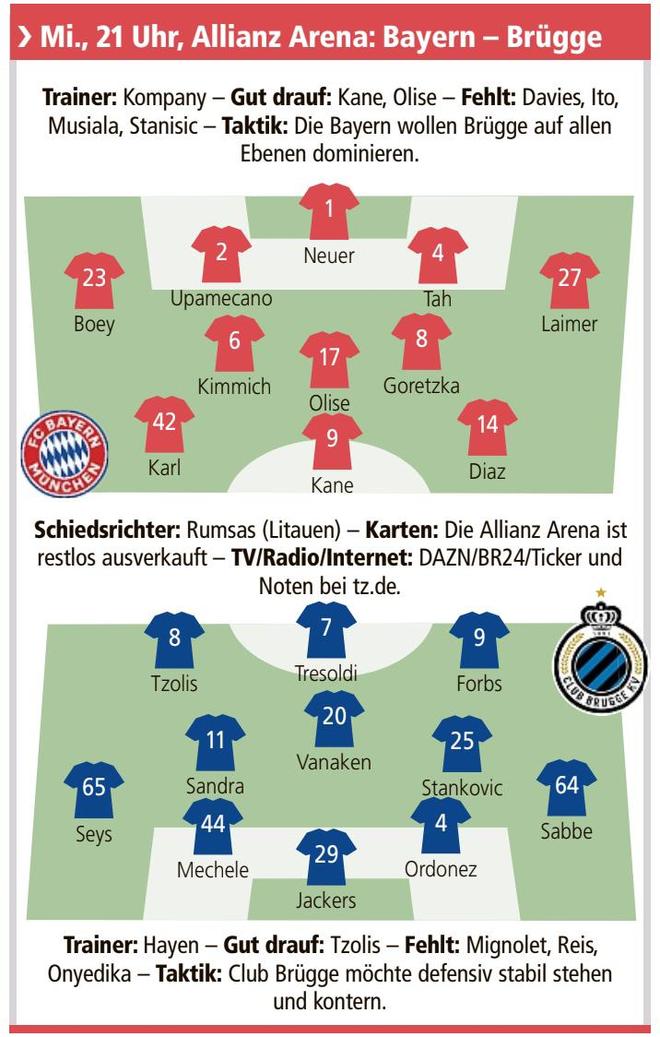 雷速体育10月22日讯 北京时间10月23日,欧冠联赛阶段第3轮,拜仁慕尼黑坐镇主场迎战比利时球队布鲁日,本场比赛开始之前,德国媒体《慕尼黑日报》预测双方首发阵容。拜仁慕尼黑方面由目前脚感火热的凯恩领衔,球队青训小将伦纳特·卡尔也将获得机会。